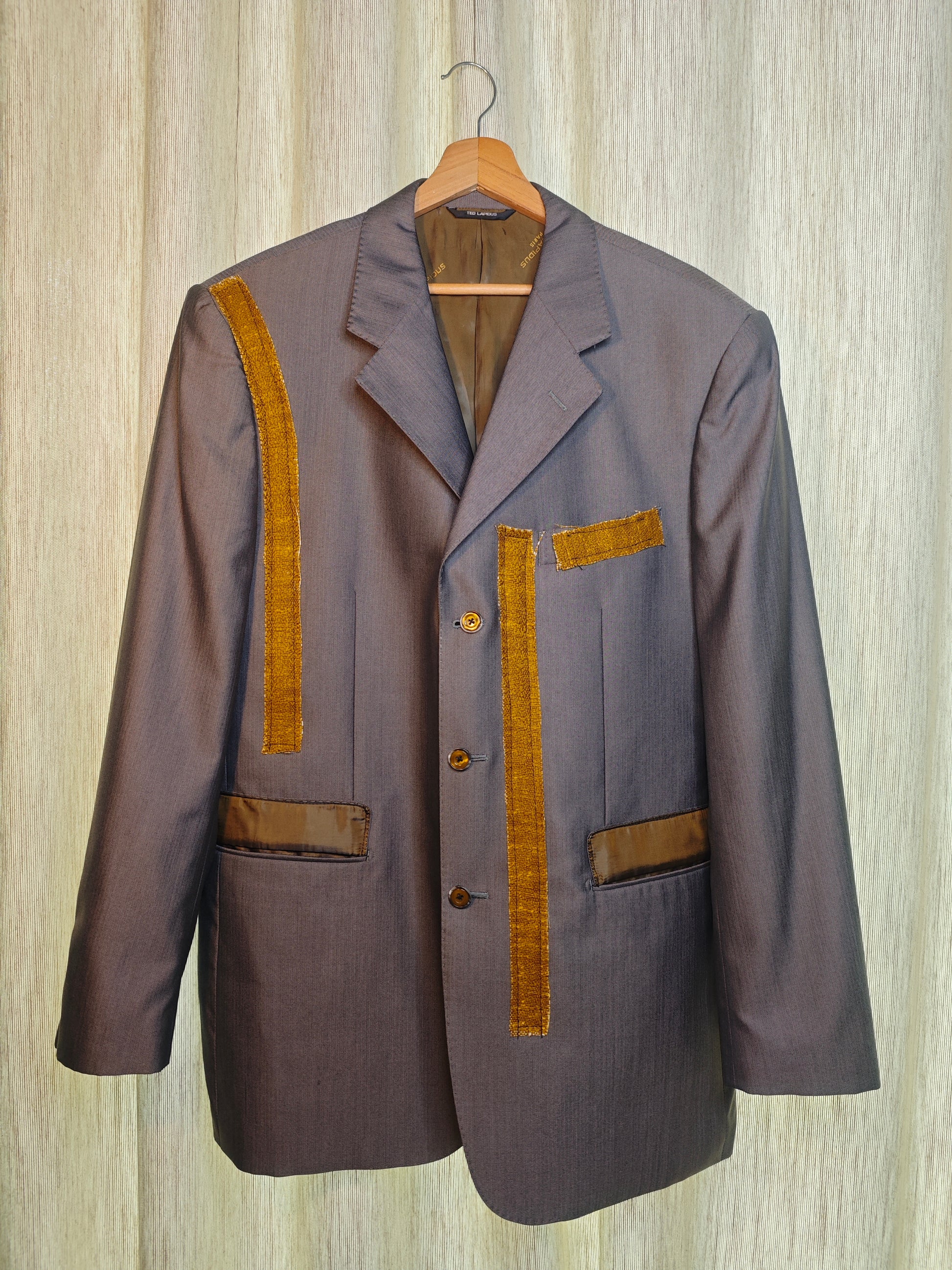 Przygotowanie i odświeżenie marynarki w celu stworzenia projektu modyfikacji krawiecko - artystycznych przy użyciu maszyn do szycia, materiałów, elementów krawieckich z drugiego obiegu.